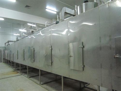 整個生產線為全封閉型(對物料而言),由擺動布料段、干燥段、出料段三部分組成。擺動布料段作用使海藻均勻分散在網板上,并且勻速輸送到干燥段,海藻經過80℃熱風干燥段,90℃熱風干燥段和120℃熱風干燥段后,再經過出料段排料。循環風向及各單元內風的循環為向下式,即加熱后的空氣由引風機吸入,在風機出風口首先預分布再經過孔板均風后,熱風從物料的下面向上(或從物料的上面向下)穿透物料層。