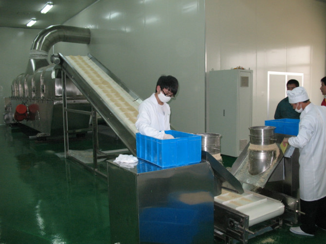 2、該生產線的核心部分:干燥系統。采用分段加熱的方式,預干燥段采用高壓低風量風機,使較濕的雞精顆粒能完全流化;干燥段采用低壓高風量的風機,單位時間內帶走水份多,干燥均勻;冷卻段采用高風量風機,能迅速帶走熱量,降低產品溫度,既達到水分控制的要求,又方便后續包裝工藝。