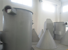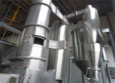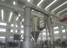 空氣經過加熱器被加熱至~230℃左右,進入旋轉閃蒸干燥機。濕料由輸送裝置送入螺旋加料機構,螺旋加料器可無級調速。物料經擠壓后強制進入主塔,隨即被高速旋轉而又具有不同角度的刀片粉碎,又被高速進入旋轉閃蒸干燥機主塔的高溫氣流沖擊高速旋轉、夾帶上升,這時氣流溫度急速下降,物料水分迅速蒸發從而完成干燥過程。被干燥的物料隨高速高溫氣流進入脈沖布袋除塵器。氣流由濾袋外部進入,向上排出,為防止濾袋積料,由脈沖電磁閥定時、輪流由各濾袋上部輸入高壓氣流(0.5~0.6Mpa),反復反沖濾袋,以達到*佳除塵效果。