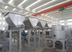 熱空氣由主機底部進風口切向進入閃蒸干燥機主塔、在閃蒸干燥機主塔內形成螺旋形的上升高速旋轉氣流,同時根據不同的物料性質調整底部環隙大小,使風速處于合適的狀態。物料經螺旋加料器直接進入閃蒸干燥塔,在高速氣流的沖擊和帶動下,迅速分散并隨氣流作高速旋轉運動。對于比較大且潮濕的顆粒團,高速氣流不足以使之破碎并高速旋轉,于是在重力作用下逐漸下落,當落到主機底部時被設置在底部的破碎裝置強行破碎并微粒化,然后隨高速氣流一并旋轉上升而完成干燥過程。為了使物料的終水分達到極低同時不受初水分的波動而影響產品質量,在干燥塔內設置多層旋流片,形成較為穩定的流態化床,同時旋流片亦起到保證干燥所必須的停留時間和分級的作用。