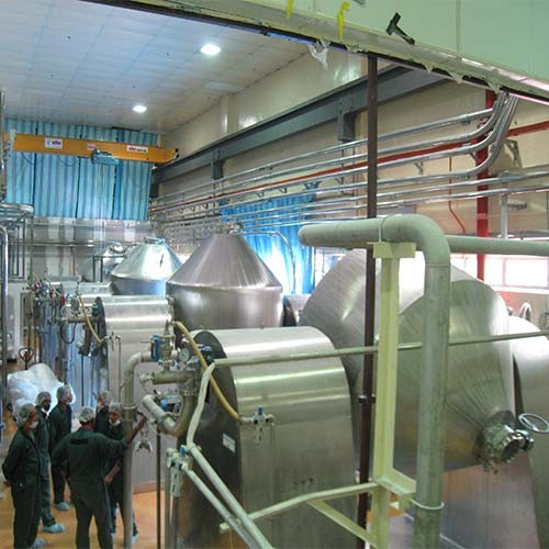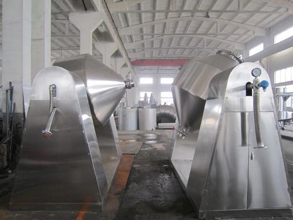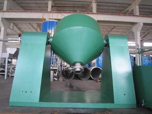 雙錐回轉真空干燥機是集混合—干燥于一體的新型干燥機。將冷凝器,真空泵與干燥機配套,組成真空干燥裝置。(如不需要回收溶劑,冷凝器可不用)本機設計先進,內部結構簡單,清掃容易,物料能全部排出,操作簡便。能降低勞動強度,改善工作環境。同時因容器本身回轉時物料亦轉動,但器壁上不積料,故傳熱系數高,干燥速率大,不僅節約能源,而且物料干燥均勻充分,質量好。可廣泛應用于制藥、化工、食品、染料等行業的干燥。