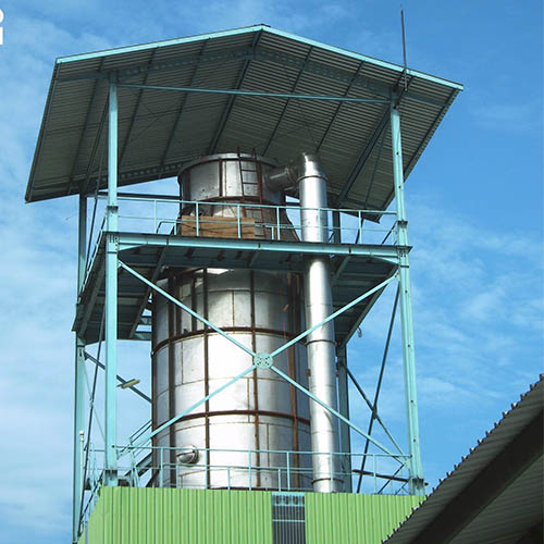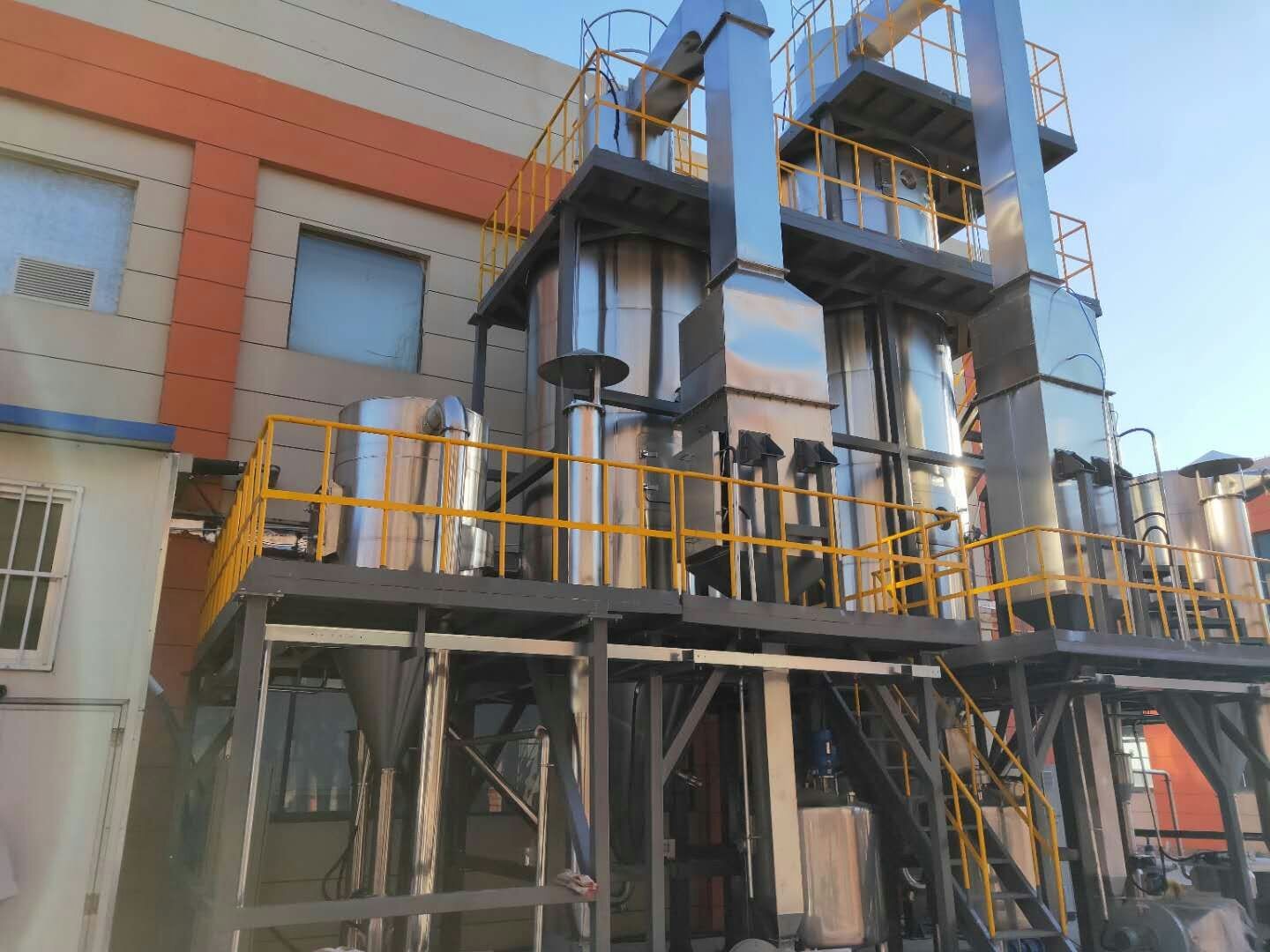 壓力噴霧干燥機工作過程為:料液通過隔膜泵高壓輸入,噴出霧狀液滴,然后同熱空氣并流下降,大部分粉粒由塔底排料口收集,廢氣及其微小粉末經旋風分離器分離,廢氣由抽風機排出,粉末由設在旋風分離器下的收粉筒收集,風機出口處還可裝備二級除塵裝置,回收率在96%-98%。