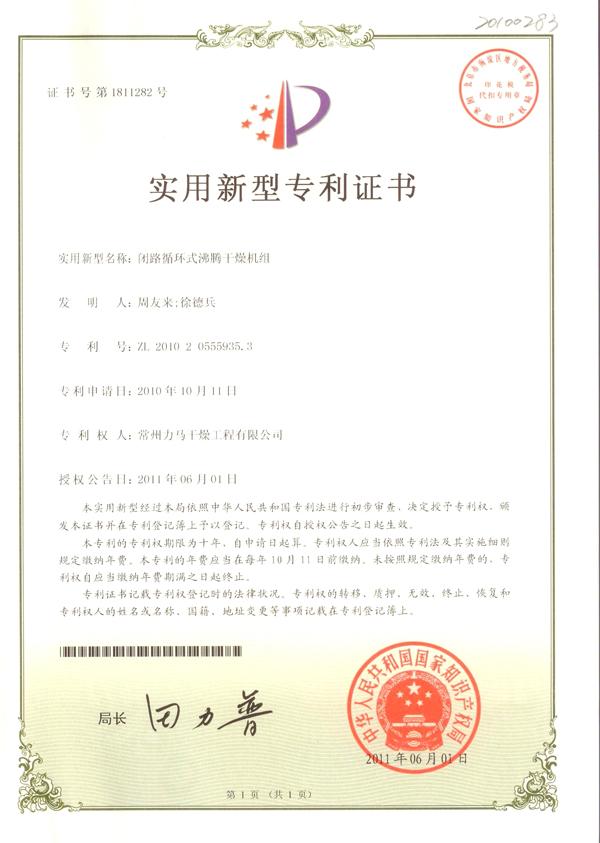 閉路循環式沸騰干燥機組專利證書