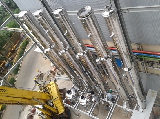 5:濃縮 濃縮一般分為真空濃縮、離心濃縮和冷凍(濃縮,這里采用真空濃縮。它通過真空降低水的沸點,真空度達-0.08Mpa以上,此時水的沸點只有60度左右,從而使液體加快濃縮,濃縮液的濃度一般不超過60%(折光度計)。由于從蒸發塔出來的濃縮液溫度高于常溫,因此必須經過冷卻再送入貯罐,從而減少流失。