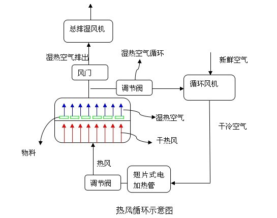 熱風循環風機在吸入新鮮空氣的同時,吸入一部分從干燥室出來的濕熱空氣,以充分利用熱能。空氣經過翅片式電加熱管后被加熱,送入干燥室由下往上吹送對物料進行烘干,如圖所示。