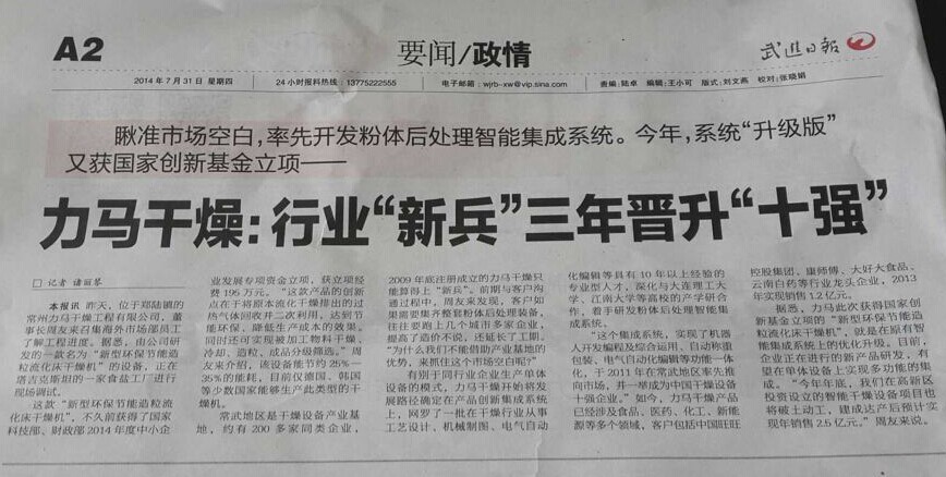 【《武進日報》A2版報道力馬干燥】