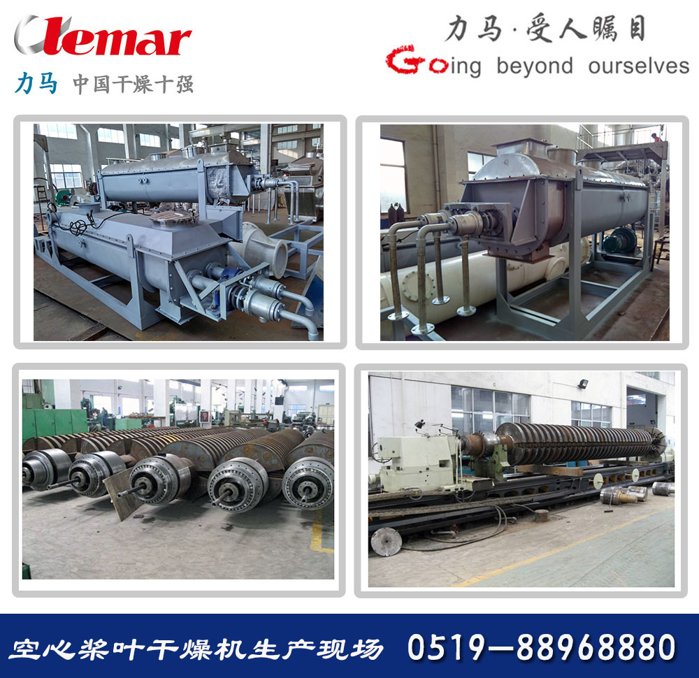 此次臺塑集團向常州力馬訂購的通軸式空心槳葉干燥機主要通過熱傳導來實現干燥功能,它的核心是兩根空心軸和焊在軸上的空心攪拌槳葉。槳葉形狀為楔形的空心半圓形,可以通入加熱介質,除了起攪拌作用外,也是設備的的傳熱體。槳葉的兩主要傳熱側面成斜面,因此當物料與斜面接觸時,隨著葉片的旋轉,顆粒很快就從斜面滑開,使傳熱表面不斷更新,強化了傳熱效果。在槳葉的三角形底部設有刮板,以將沉積于殼底的物料刮起,防止產生死角。在進料區、干燥區、排料區除槳葉外,另設有輔助機構,以保證整機操作穩定,干燥均勻。