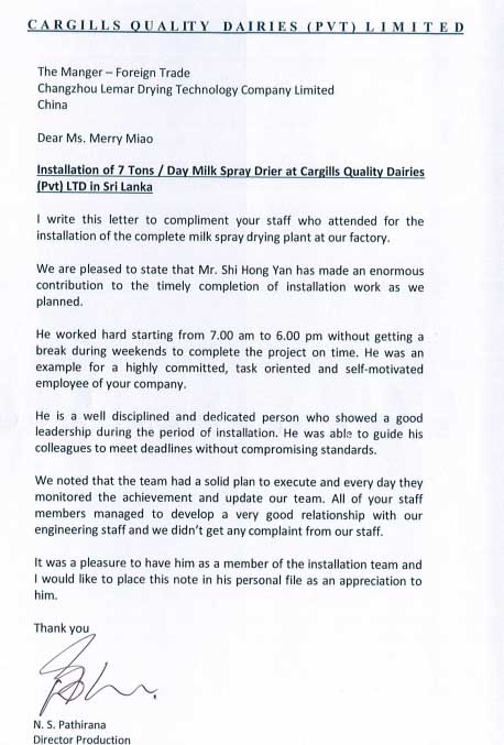 信中這樣寫道:“親愛的Merry Miao女士:我寫這封信主要是想要贊美一下你公司的這次參加了我們廠完整的牛奶噴霧干燥設備安裝的員工。我們真的很高興,特別是史洪雁先生,他在這次安裝任務中作出了巨大的貢獻,他按照我們的計劃時間表提前完成了安裝工作。他工作很努力,每天從早晨7點到下午6點,周末都沒有休息,只為了能夠按時保質保量完成項目。他代表著一個致力于任務導向和自我激勵的公司。并且他是一個很有紀律的人,在領導小分隊安裝期間,嚴格要求自己,一直堅持到最后完成安裝。我們還注意到,你們的團隊計劃非常明確,每天都在監控設備的使用情況,并對我們的人員進行現場培訓。你們所有的員工與我們的工程人員都相處得非常愉快,我們沒有得到任何來自我們員工的投訴。最后,我想說的是,我把史洪雁先生寫在信中,只是因為單純的欣賞這個人。”