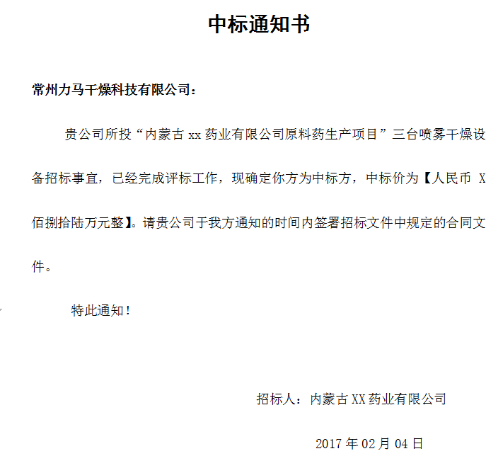 經過廣泛的調研和嚴格的測驗,內蒙古xx藥業有限公司,最終決定向常州力馬科技有限公司定購三臺原料藥噴霧干燥機,單筆金額高達百萬余元,貢獻力馬新春第一單,為力馬贏得了農歷雞年的頭彩。同時也展示了內蒙古xx藥業有限公司蓬勃的生機和迅猛的發展勢頭,真誠祝愿兩家公司合作愉快、雞年大吉。